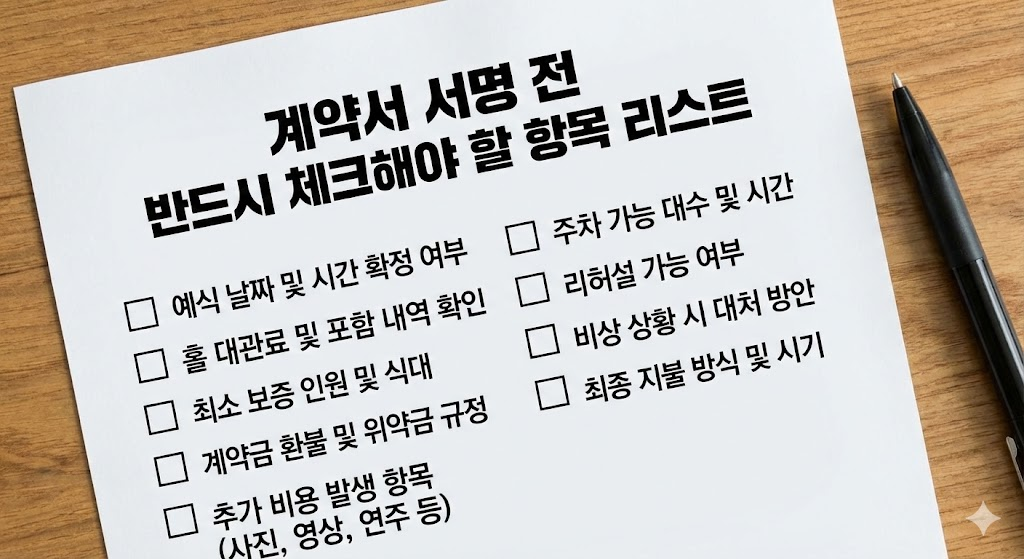 결혼 준비의 설렘을 안고 처음 방문한 웨딩홀. 화려한 조명과 꽃장식에 마음을 뺏기기 십상이죠. "여기서 하면 정말 예쁘겠다!"라는 생각이 드는 순간, 덜컥 계약서에 서명하고 싶어질지도 모릅니다.