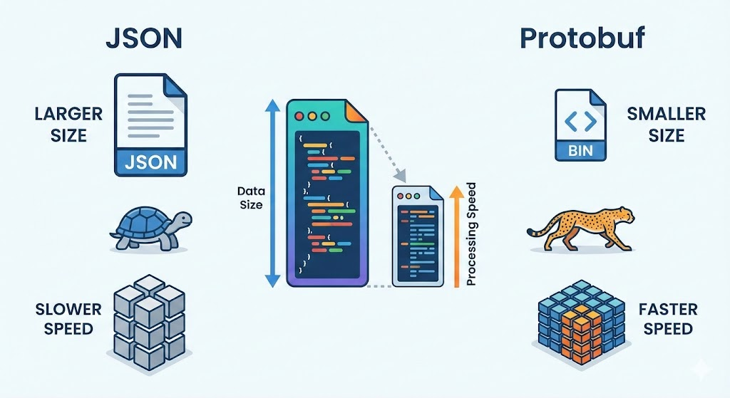 Protobuf는 데이터를 바이너리로 압축하여 전송합니다. 텍스트 기반인 JSON보다 전송 크기가 훨씬 작으며, 직렬화/역직렬화 속도가 약 3배에서 10배까지 빠릅니다. 이는 실시간 처리가 중요한 게임 서버나 gRPC 통신에서 결정적인 성능 차이를 만듭니다.